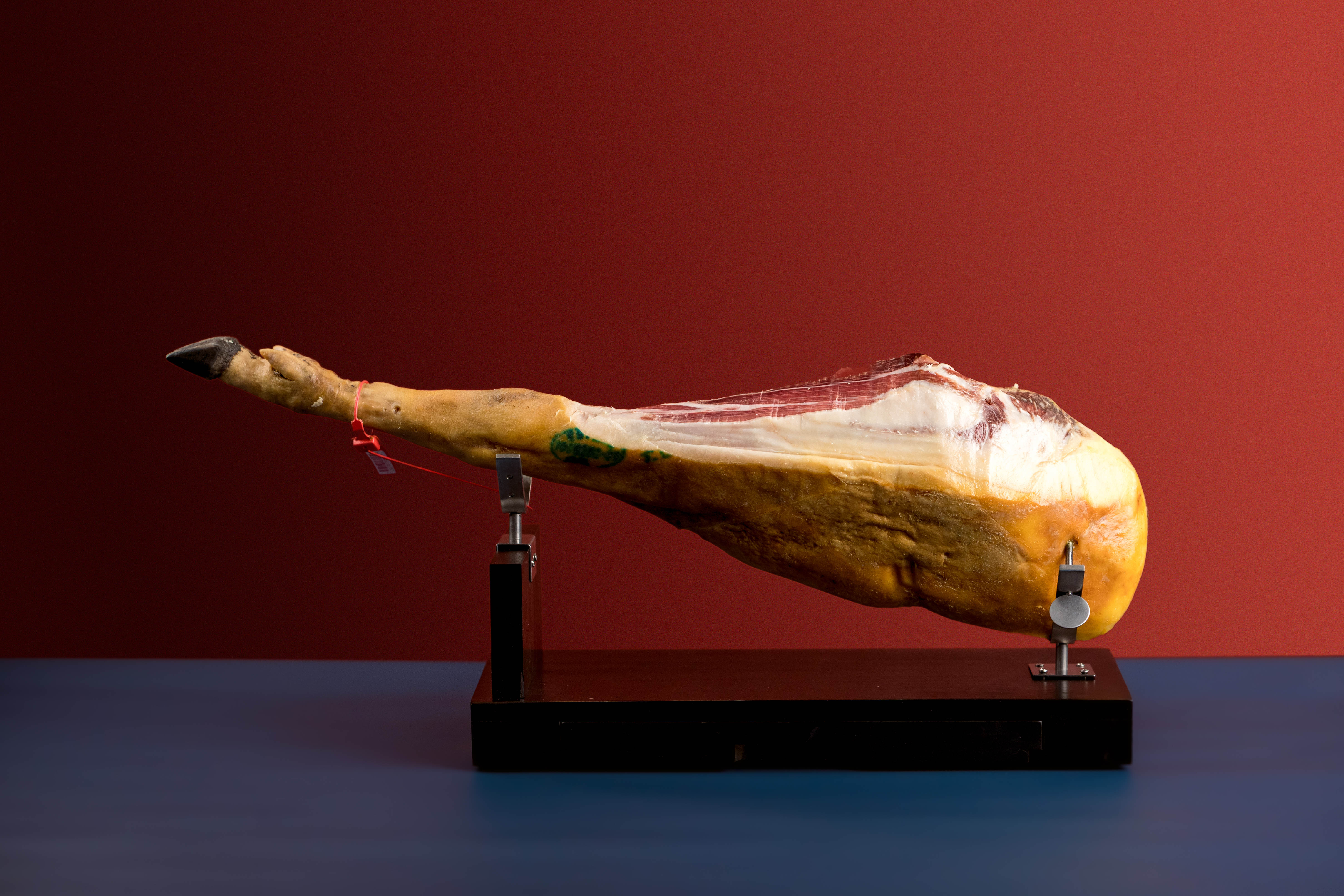 白标保证75%或50%的伊比利亚血统猪(准确血统因火腿而异)这种火腿的特征是有大量具有光泽的肉质。
